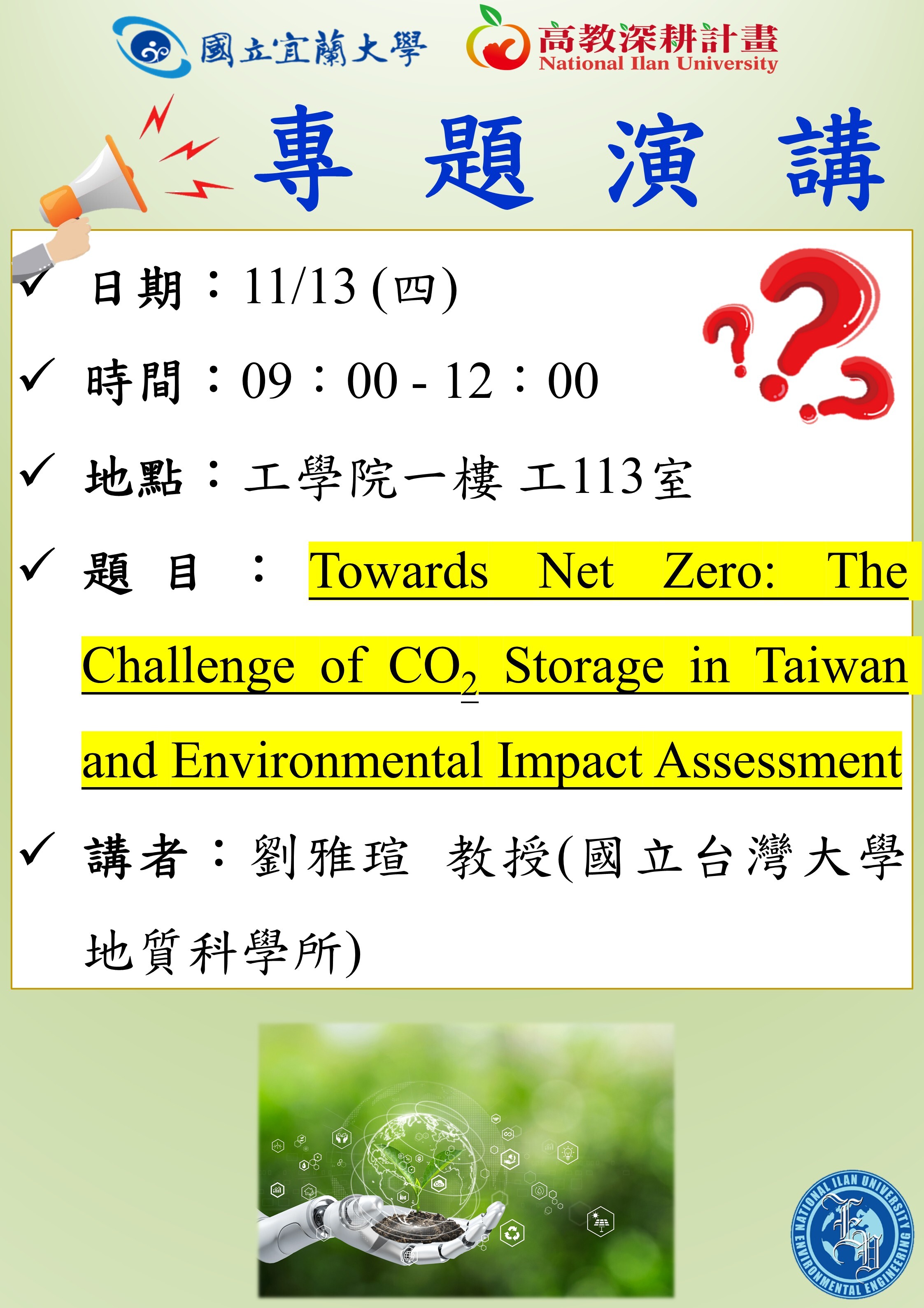 環境工程學系-環境永續系列專題演講:12/3「Towards Net Zero: The Challenge of CO2 Storage in Taiwan and Environmental Impact Assessment」